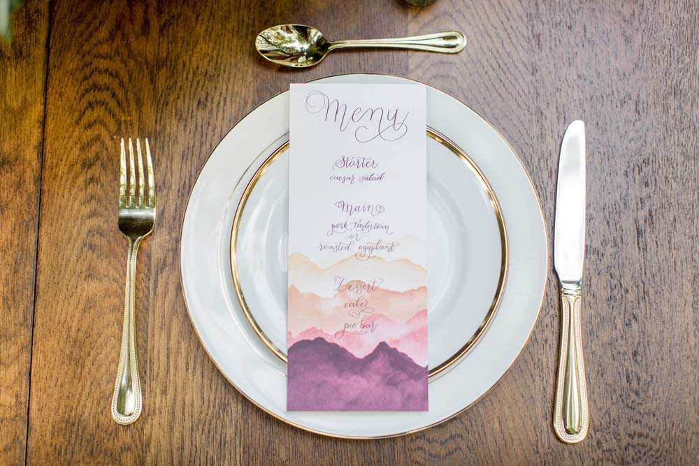 Unless your guests picked their meals on their reply card, you’ll want to let everyone know what’s on the menu. For a served meal, you may do individual menus at each place setting (and then you can also put each guests name on it like a place card) or do a larger menu at the center of each table (and it can double as the table number).